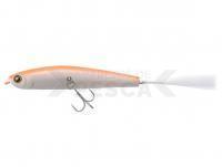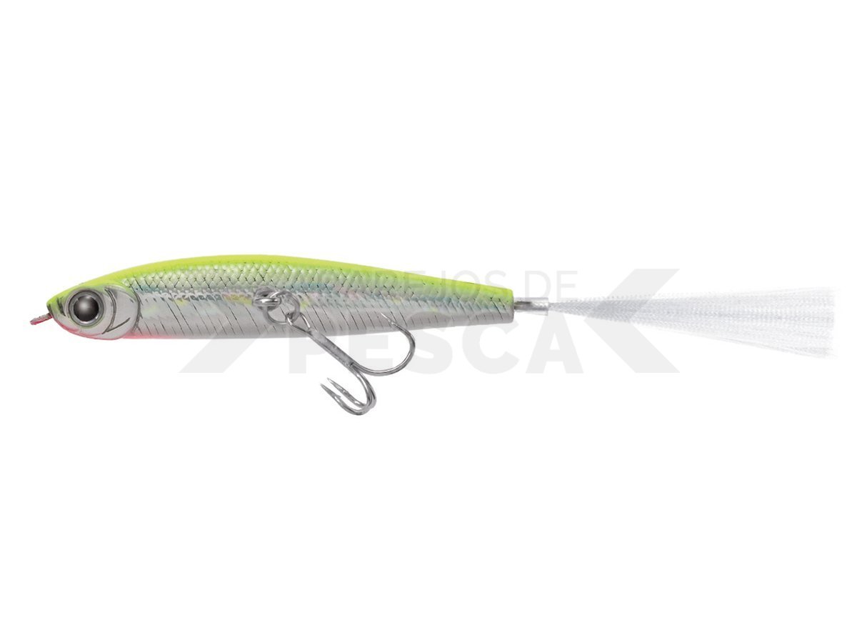 Imitación autonómica de olores en superficie. Este cebo imita un eperlano flotante. Flota a 45 grados y el cuerpo se balancea por las olas y los vientos, por lo que no necesita realizar ningún movimiento mediante varillas. Déjalo a la deriva y automáticamente le da al pez una imagen de olor moribundo. Para una mejor penetración del anzuelo, la extensión del vástago no permite que el anzuelo toque el cuerpo. El gancho también funciona como péndulo para que el cuerpo ruede más. Ponemos el TMC MORPHO FIBER en la parte de la cola. La fibra Morpho es un material estructuralmente coloreado que imita el mecanismo que hace que las escamas de las alas de la mariposa Morpho muestren color. Su autoiluminación natural y delicada y su movimiento atraen a los peces. Pintó una marca naranja como indicador para que pueda detectar el cebo.